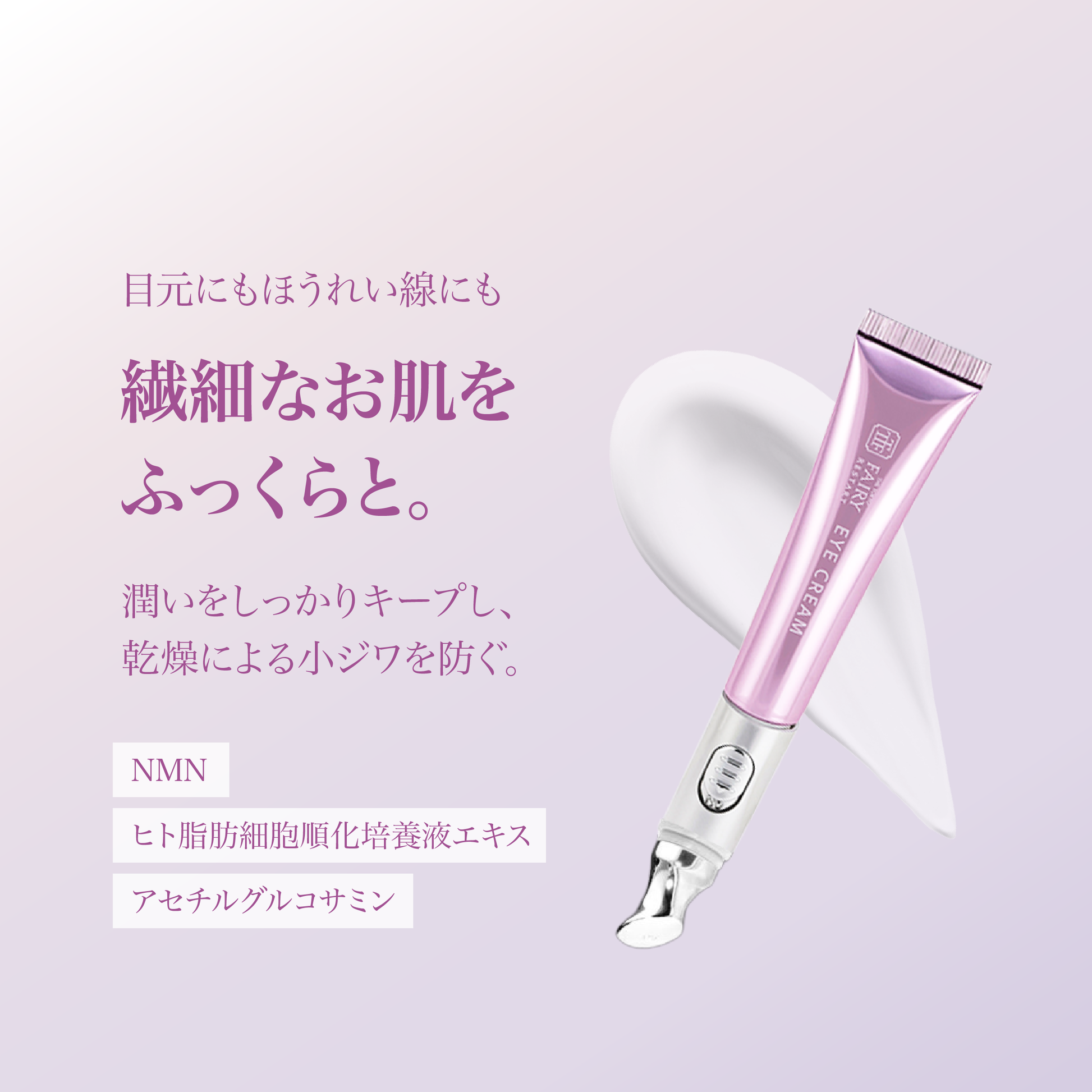 Apply a small amount, roughly the size of a grain of rice, under each eye. Be careful not to dispense too much at once. Gently slide the tip of the container from the inner corner of your eye to the outer corner. If any cream remains, lightly blend it in with the pads of your fingers. Can also be used for eye care (reducing bags under the eyes, wrinkles at the corners of the eyes, and dark circles) and nasolabial folds.